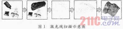 0 引言 自然對象和大部分的人造對象都具有復雜的三維形狀,如何在計算機中建立三維對象的計算機模型就是三維形狀的數(shù)字化問題,該項研究源于20世紀六七十年代。三維形狀復雜多變、形狀繁多,而且其外觀、材質(zhì)、顏色、用途等各不相同,這就使得三維形狀數(shù)字化的問題非常復雜,至今,該項技術尚未成熟,仍是數(shù)字化技術研究的難點。目前,三維形狀數(shù)字化技術種類很多,包括機械、聲學、光學、電磁等類型,其中運用得最廣泛、效果最好的是光學測量技術。光學測量是光電技術、機械測量、計算機技術相結合的產(chǎn)物,可以實現(xiàn)快速,準確的測量。該項技術具有速度快、精度高、非接觸、易于自動化的特點,主要適用于自由曲面的測量。目前,光學測量技術得到了越來越廣泛的應用,其中最典型的應用是三維激光掃描儀。 1 三維激光掃描儀的工作原理 三維激光掃描儀是基于激光掃描測量的原理而設計的,主要作用是對三維形狀進行數(shù)字化,基本工作原理是:線激光器發(fā)出的光平面掃描物體表面,面陣CCD采集被測物面上激光掃描線的漫反射圖像,在計算機中對激光掃描線圖像進行處理,依據(jù)空間物點與CCD面陣像素的對應關系計算物體的景深信息,得到物體表面的三維坐標數(shù)據(jù),快速建立原型樣件的三維模型,如圖1所示。