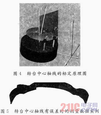 式中:P1,P2,P3旋轉(zhuǎn)到與xOy平行的平面上就可以很容易求出圓心,然后將圓心再依次繞x軸、z軸反向旋轉(zhuǎn)β和α,即得到O”,轉(zhuǎn)臺中心軸線的方向和位置得到確定。