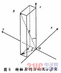 為精確標定轉(zhuǎn)臺中心軸線,提出如下方案:在圖4的轉(zhuǎn)臺上固定一個標定球。通過數(shù)控系統(tǒng)控制轉(zhuǎn)臺旋轉(zhuǎn),控制球的球心繞轉(zhuǎn)軸R形成一個圓,該圓的圓心O“是R上的點,該圓所在平面的法矢即為R的方向。 基于該思路,在xyz三軸測量系統(tǒng)中測量并計算標定球三個不同位置的球心P1(x1,y1,z1),P2(x2,y2,z2),P3(x3,y3,z3),P1,P2,P3所在平面的法矢量N即為轉(zhuǎn)臺中心軸線的方向。 有了轉(zhuǎn)臺中心軸線的方向,還需要確定空間三點P1,P2,P3繞轉(zhuǎn)軸R形成圓的圓心O”(x0,y0,z0)才能使轉(zhuǎn)臺中心軸線定位。如圖6,為了求O“,首先計算轉(zhuǎn)軸R在xOy面上的投影與y軸夾角α、R與z軸的夾角β,然后P1,P2,P3依次繞z軸、x軸旋轉(zhuǎn)到與xOy平行的平面上,旋轉(zhuǎn)矩陣分別為: