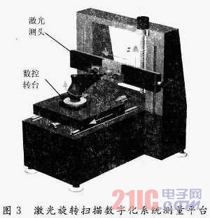 3 系統(tǒng)構成 圖3是三維旋轉(zhuǎn)激光掃描系統(tǒng)的測量平臺,x軸左右運動,向左為正向;y軸前后運動,向前為正向;z軸上下運動,向上為正;三軸之間互相垂直;數(shù)控轉(zhuǎn)臺安裝在沿y軸運動的花崗巖工作臺面上。激光測頭隨x軸的拖板一起運動。