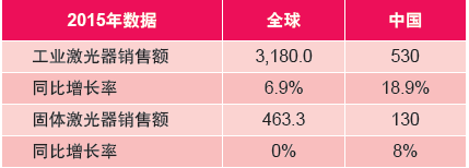 表1:2015年全球及中國(guó)工業(yè)激光器與固體激光器銷售情況(百萬美元)
